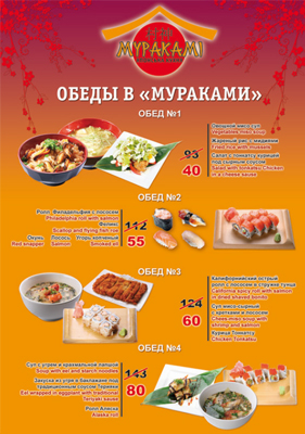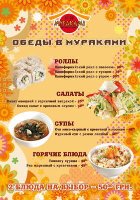 Если Вы любите совмещать полезное с приятным, то комплексные обеды в ресторанах «Мураками» именно для Вас! Каждый день с 12:00 по 17:00 в «Мураками» на Подоле, Позняках, Крещатике, а также в ТЦ Пирамида и ТЦ Магелан действуют специальные обеденные предложения.