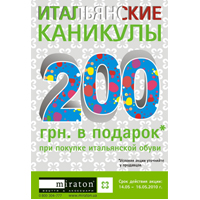 Только три дня — с 14 по 16 мая, при покупке итальянской и испанской обуви в сети «Миратон» вы получаете в подарок 200 гривен! Акционные условия распространяются на все виды обуви... подробнее >>>