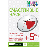 Только три дня — с 15 по 17 июня, с 15 до 17 часов, «Миратон» дарит вам дополнительную скидку 5% на всю женскую и мужскую обувь коллекции весна-лето 2010!